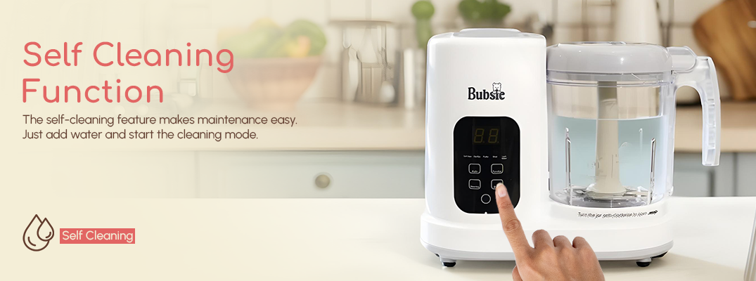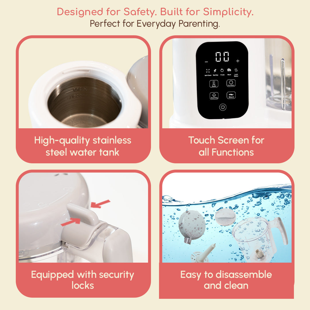 Cleanup is easy: add water, hit clean, and you’re done. The smart water-shortage reminder keeps the machine running safely, so you can prep your baby’s meals without worry.