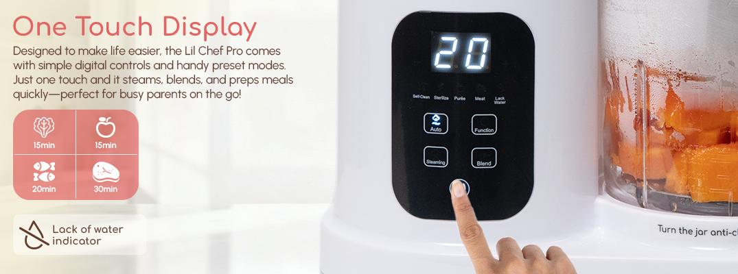 With simple digital buttons and preset modes, the Lil Chef Pro makes meal prep feel effortless. One tap handles everything—ideal for busy parents who want fast, reliable results without complicated steps.