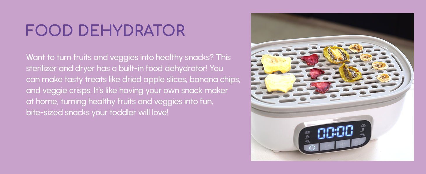 Make delicious, homemade snacks! Dehydrate fruits and veggies for nutritious toddler-friendly treats.