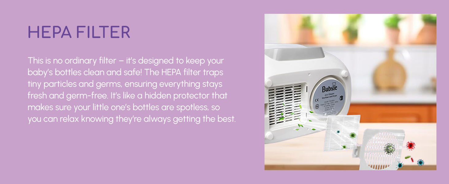 This baby bottle sterilizer and dryer is a must-have! It fits 8 bottles plus accessories, sterilizes in just 8 minutes, has a HEPA filter for clean air drying, and the storage mode keeps everything sterile until needed. Super convenient and reliable!